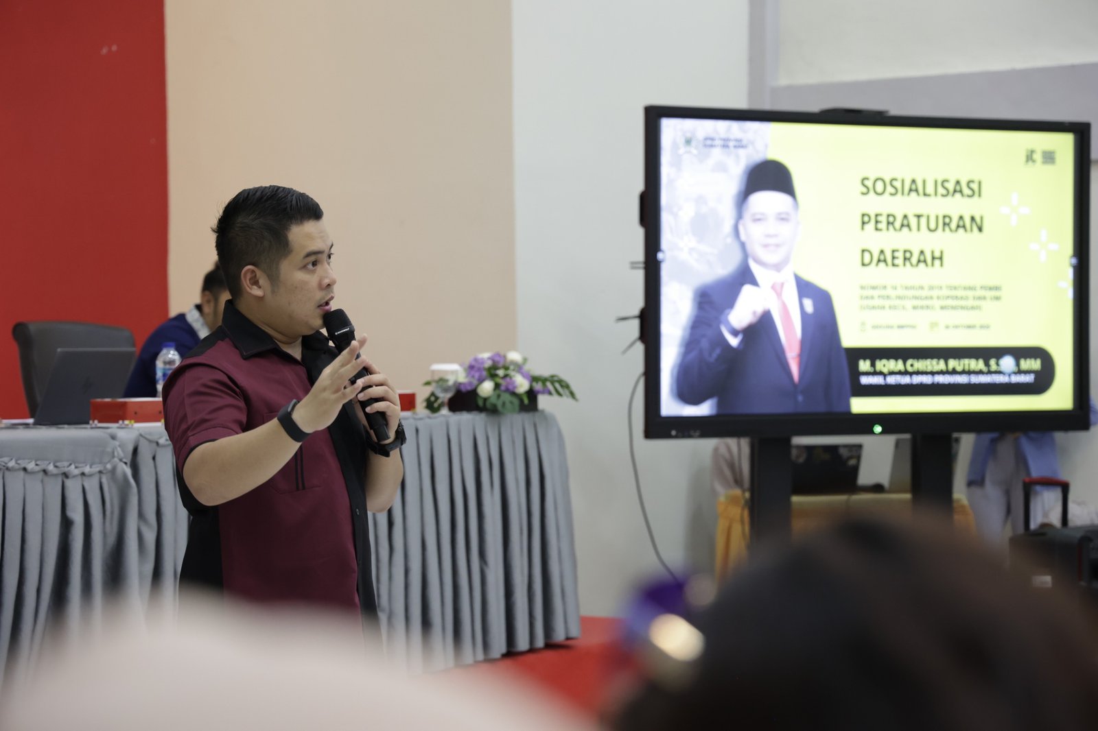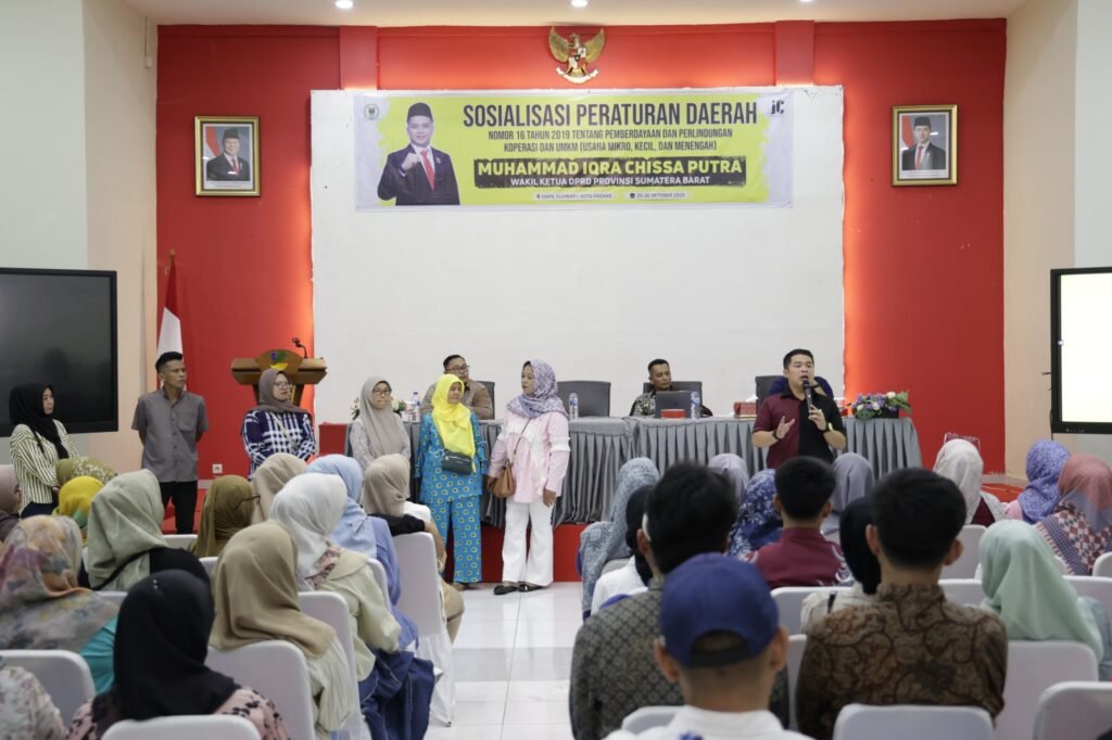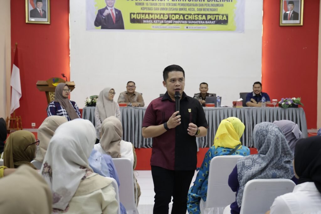 PADANG — Wakil Ketua DPRD Sumatera Barat, Iqra Chissa Putra, terus menunjukkan komitmennya dalam memperkuat perekonomian masyarakat melalui pemberdayaan pelaku Usaha Mikro, Kecil, dan Menengah (UMKM). Hal itu terlihat saat ia menggelar sosialisasi Peraturan Daerah (Perda) Nomor 16 Tahun 2019 tentang Pemberdayaan dan Perlindungan Koperasi serta Usaha Kecil, di Balai Besar Pendidikan dan Pelatihan Kesejahteraan Sosial (BBPPKS) Kemensos, Kecamatan Pauh, Kota Padang, Minggu (26/10).