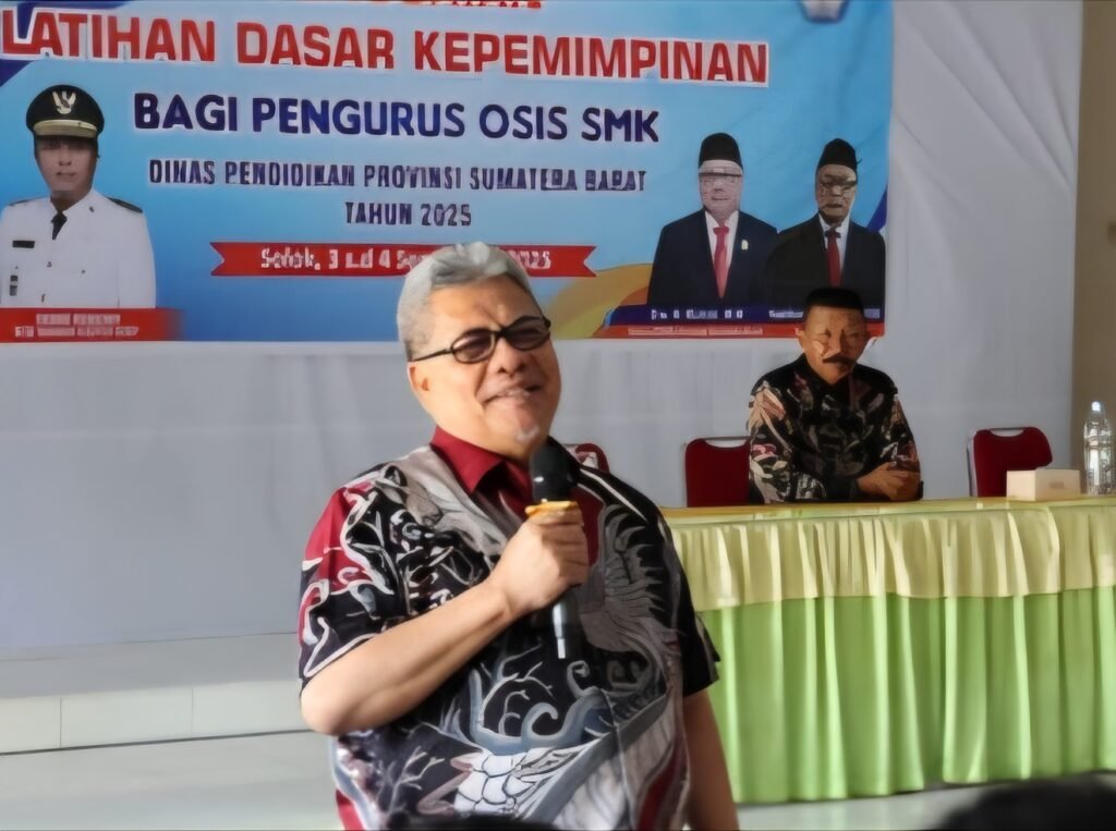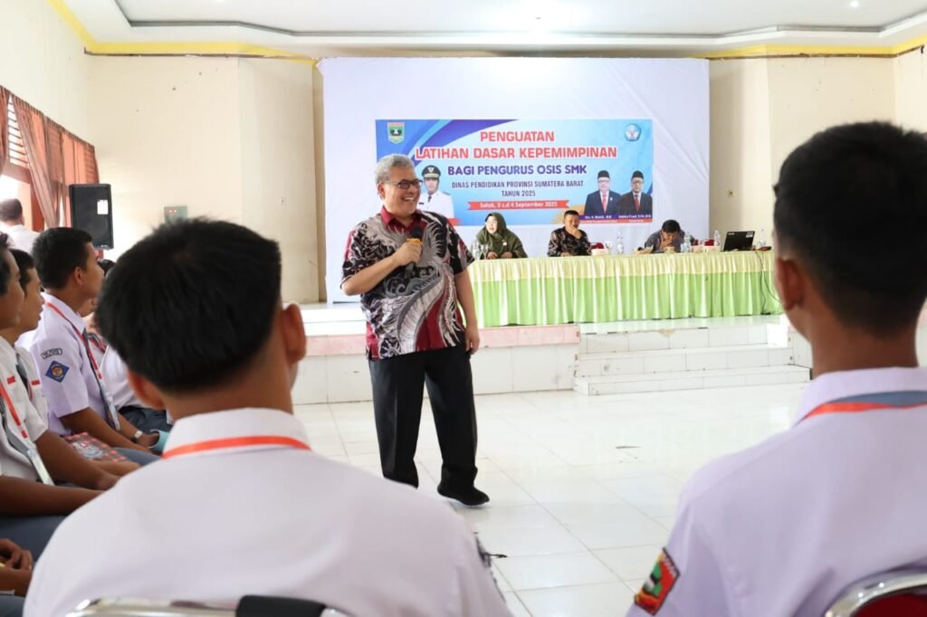 SOLOK – Ketua DPRD Sumatera Barat, Muhidi, tampil inspiratif di hadapan ratusan pengurus OSIS SMK se-Kota dan Kabupaten Solok dalam kegiatan Latihan Dasar Kepemimpinan (LDK) di SMK Negeri 1 Kota Solok, Rabu (3/9/2025). Di hadapan para pelajar, Muhidi membagikan kisah hidupnya yang penuh perjuangan—dari buruh pabrik karet hingga akhirnya dipercaya memimpin lembaga legislatif tertinggi di Sumbar.