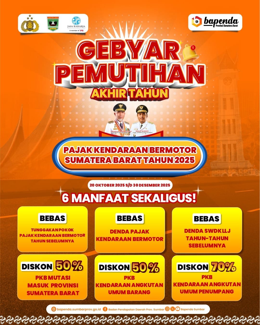 Padang – Pemerintah Provinsi Sumatera Barat kembali memperpanjang program Gebyar Pemutihan Pajak Kendaraan Bermotor (PKB) 2025 hingga 30 Desember 2025. Kebijakan ini merupakan bentuk kepedulian Pemprov Sumbar dalam meringankan beban masyarakat yang ingin melunasi pajak kendaraan mereka.